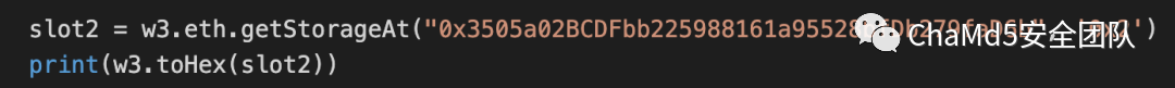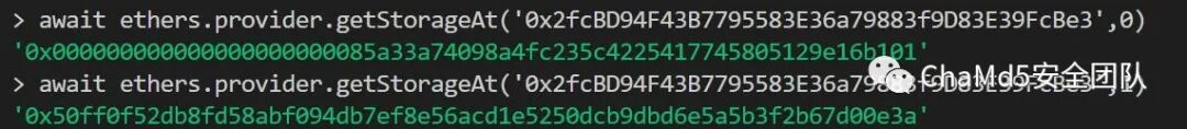 await ethers.provider.getStorageAt(‘0x2fcBD94F43B7795583E36a79883f9D83E39FcBe3’,1)