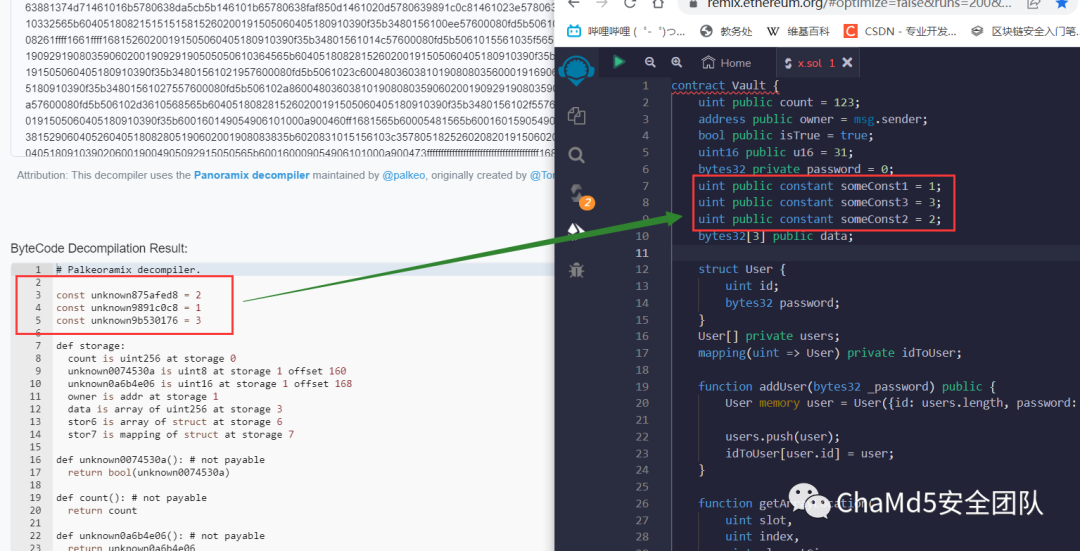 按道理:无法从bytecode和ABI中还原常量的变量名,因为常量被硬编码到字节码中,它们不是变量,不占用任何存储空间,也不会进入 ABI,常量名被编译器丢弃了,编译器只需要那个具体的值。因此无法对应找到常量名,顺序不一致,如下图。但是反编译却有时候可以反编译出常量名,真很奇怪,想不明白。先放着,继续学,没准以后学深了自然懂了