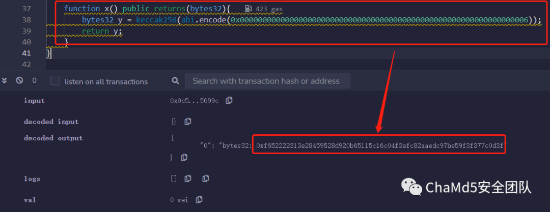 keccak256(bytes32(slot))来算出。本处的动态数组users所在的插槽是slot6,则:keccak256(abi.encode(0x0000000000000000000000000000000000000000000000000000000000000006))。下图是remix验证的结果: