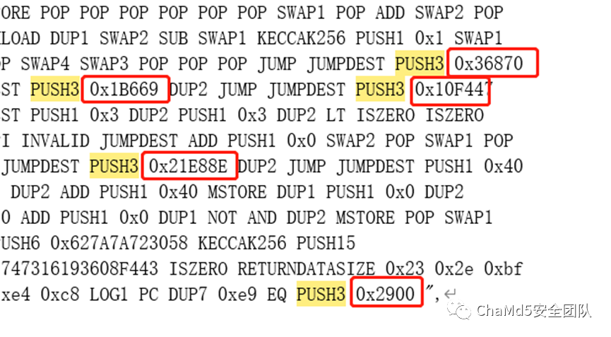 ABI中:常量都是使用PUSH。格式:PUSH3 数值。如图是其中5个PUSH3。