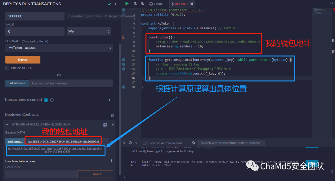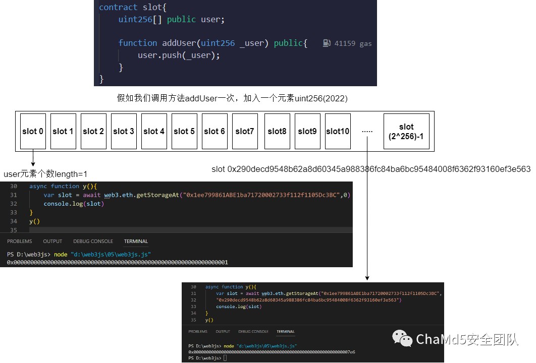 我们声明的user位于slot 0,而user的第一个元素则需要计算:slotV = keccak256(slot0) + 0。(假如有第二个元素,则位于slotV = keccak256(slot0) + 1)