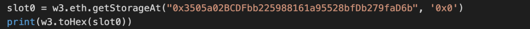 await ethers.provider.getStorageAt(‘0x2fcBD94F43B7795583E36a79883f9D83E39FcBe3’,0)