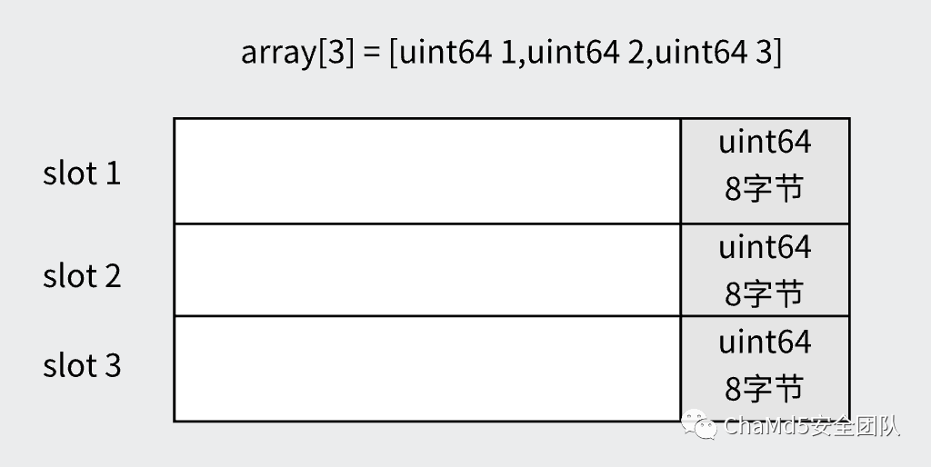 定长数组中的每个元素都会有一个独立的插槽来存储。以一个含有三个 uint64 (8字节)元素的定长数组为例,下图可以清楚的看出其存储方式: