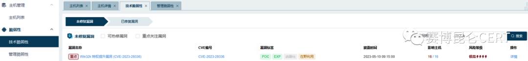 目前赛博昆仑的资产风险检测模块能够检测系统中存在漏洞的Windows版本并提示对应风险: