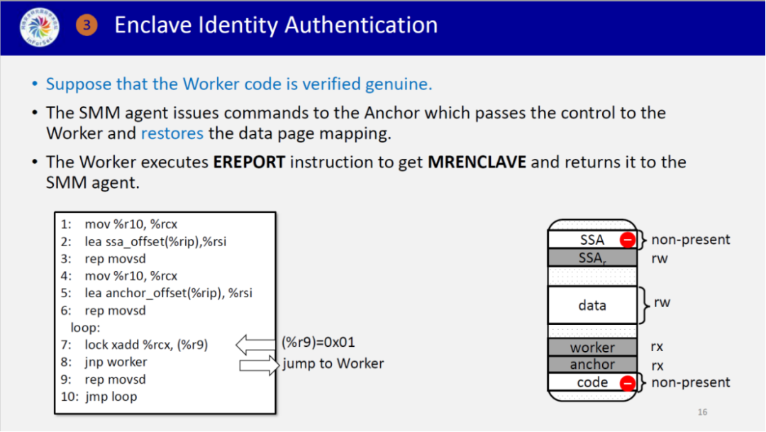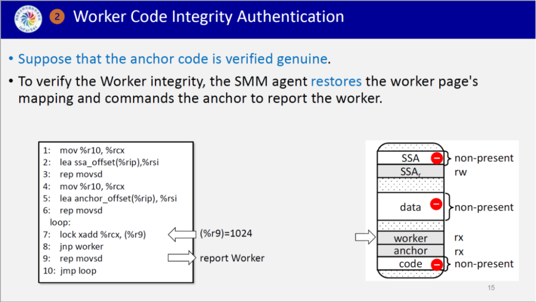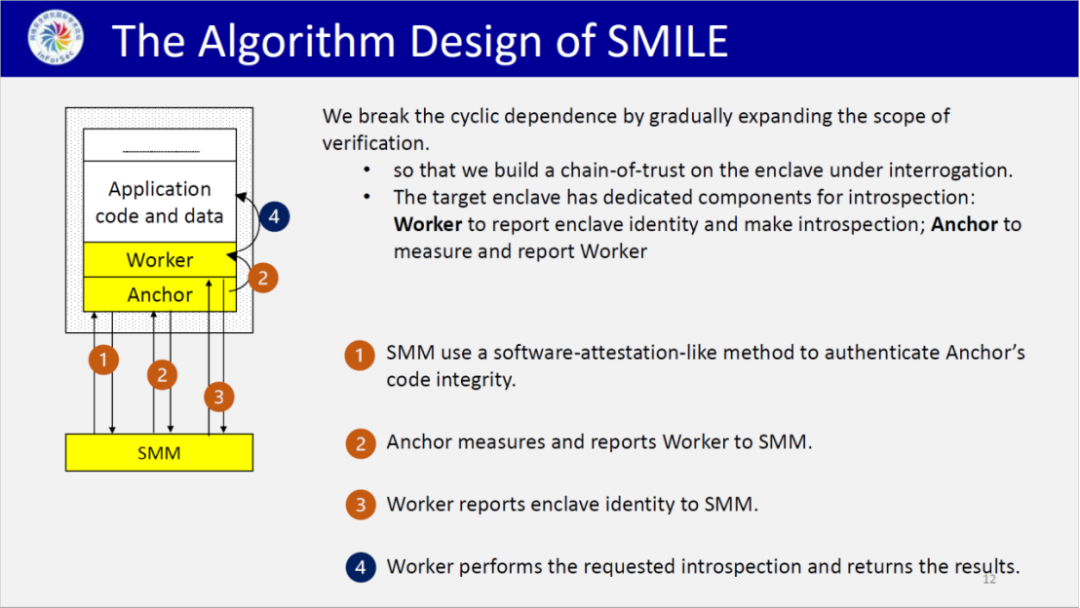 紧接着,周博士介绍了SMIL的关键算法,核心思想是通过逐步扩大的方式打破循环依赖,除了SMM外,还使用到在飞地内部内置的两个专用模块,其中Worker负责报告飞地的身份和内存状态,而Anchor负责对Worker的可信性进行测量,SMM只需要负责对Anchor进行认证。