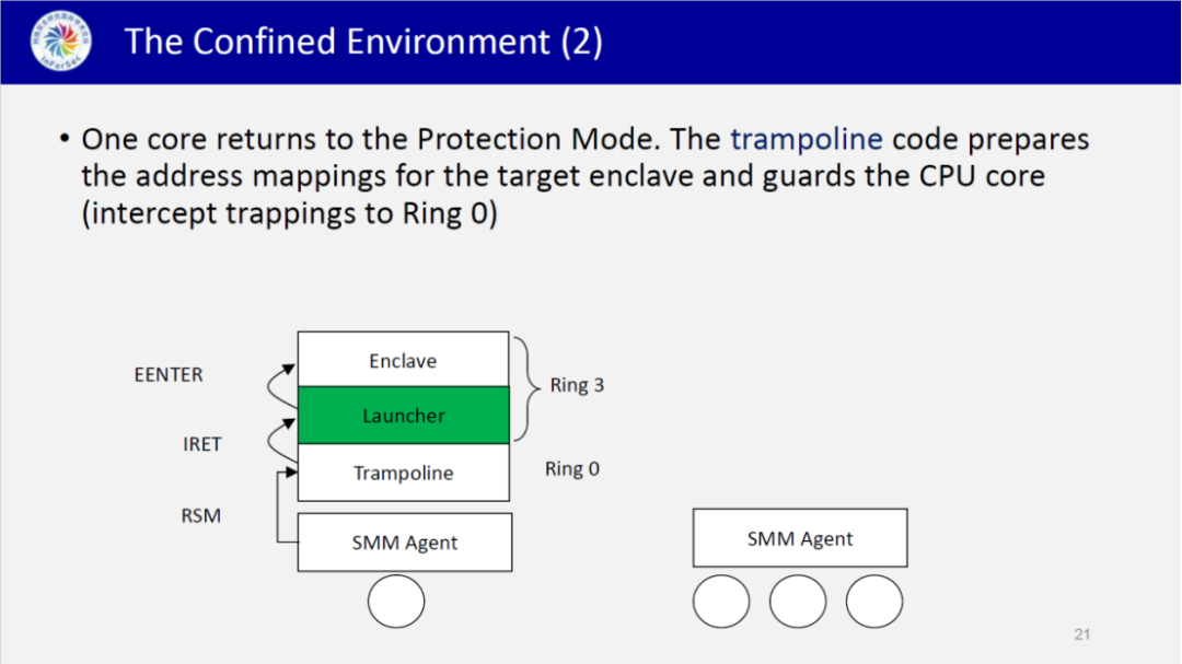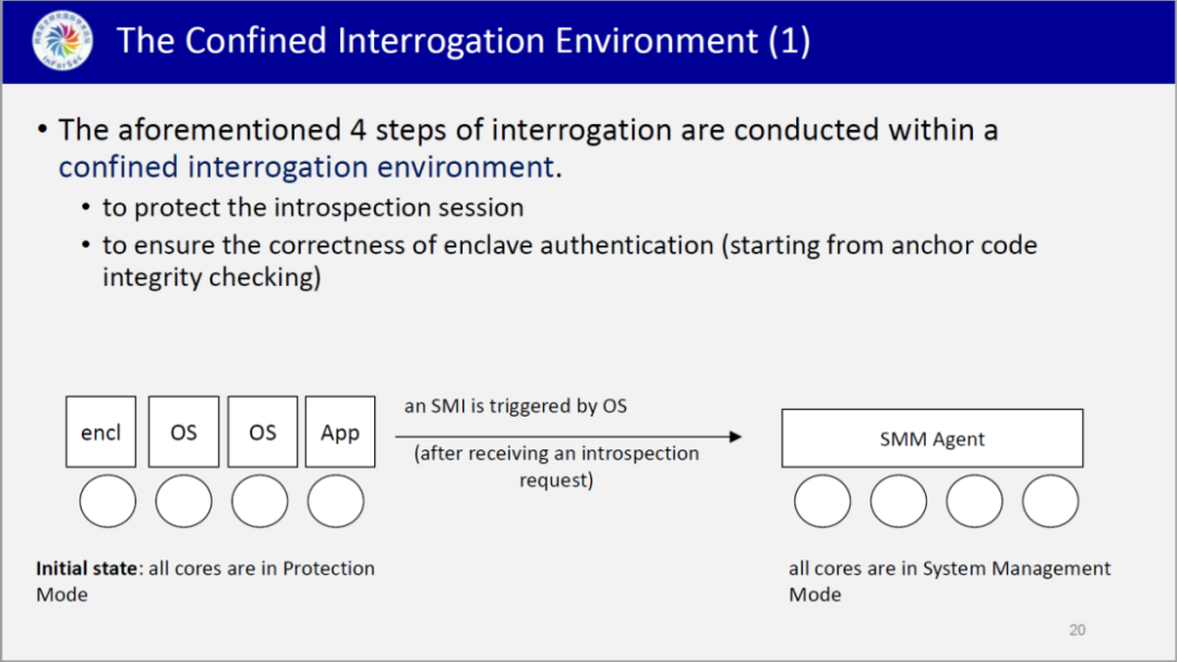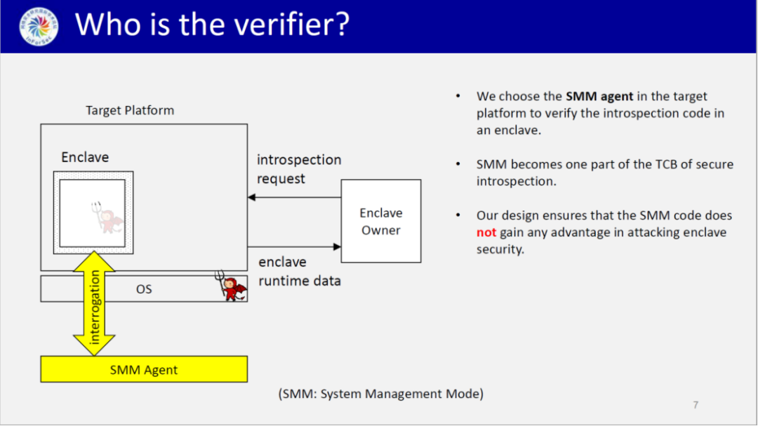 在有了初步的解决思路后,周博士他们开始思考谁可以承担外部验证的责任,经过调研他们发现了CPU硬件支持的系统管理模式(SMM)可以视作一个隔离的执行环境,在这个执行环境中可以运行一些特权的代码。