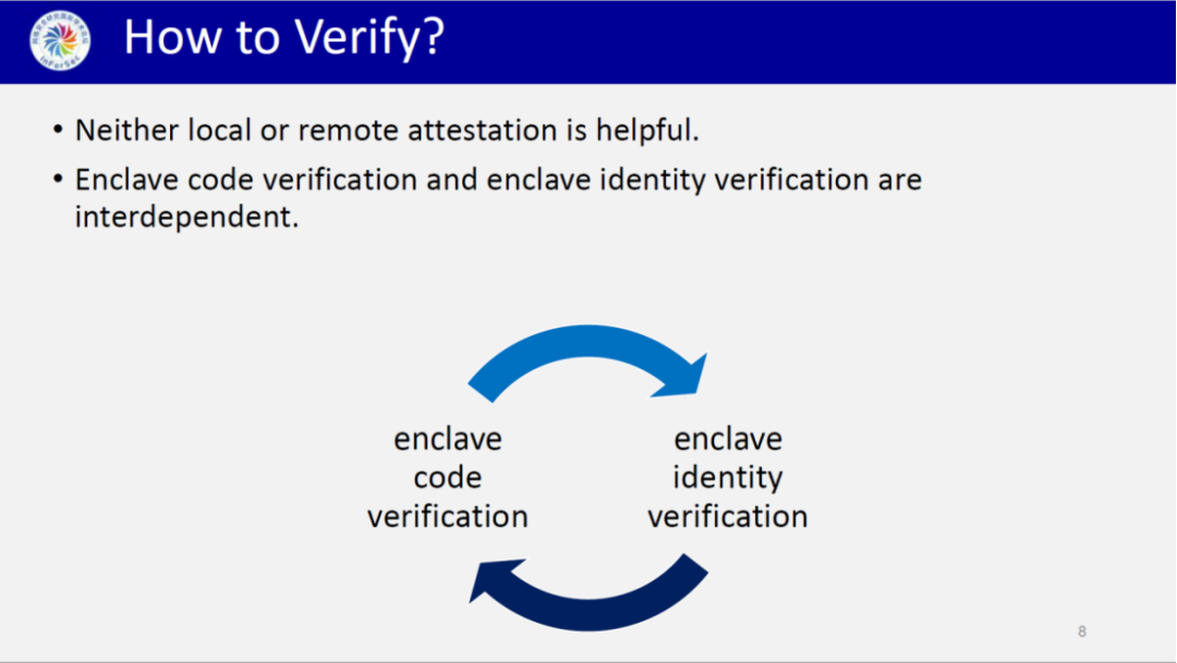 在确定了外部验证模块后,外部验证模块需要解决的问题是如何进行验证哪个飞地是要分析的飞地,以及该飞地中的代码和数据是否是可信的。周博士介绍了这里存在一个循环依赖的挑战,即飞地代码验证和飞地身份验证是互相依赖的,需要想办法打破这个死循环。