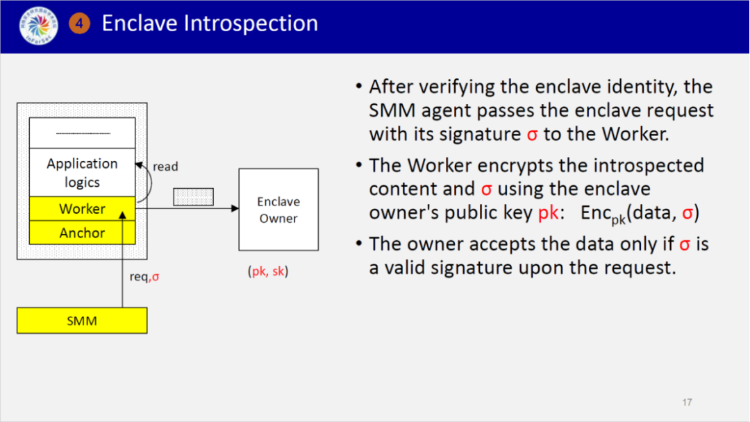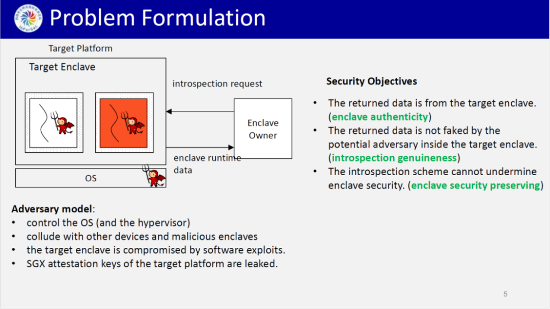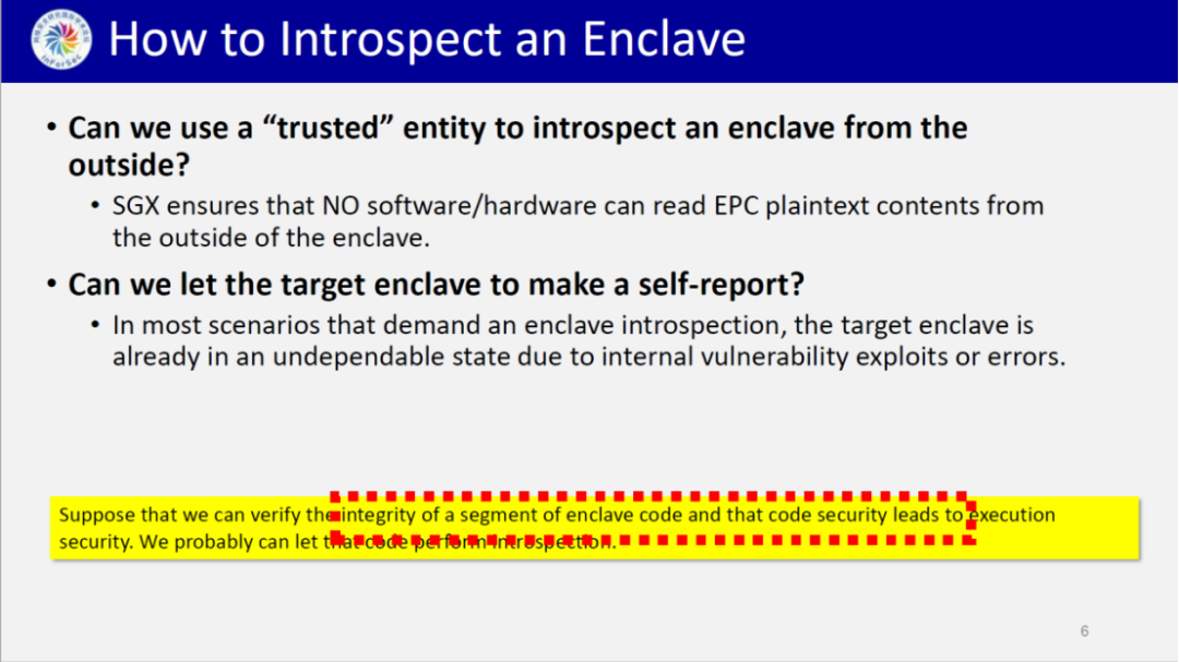 周博士指出想要实现飞地内存自省,需要同时达到三个目标,第一个是保证分析的飞地是目标飞地,第二个是要保证返回的数据是真实的数据而不能是由飞地内部攻击者伪造的数据,第三个目标是该内省机制不能够破坏飞地本身的安全性。
