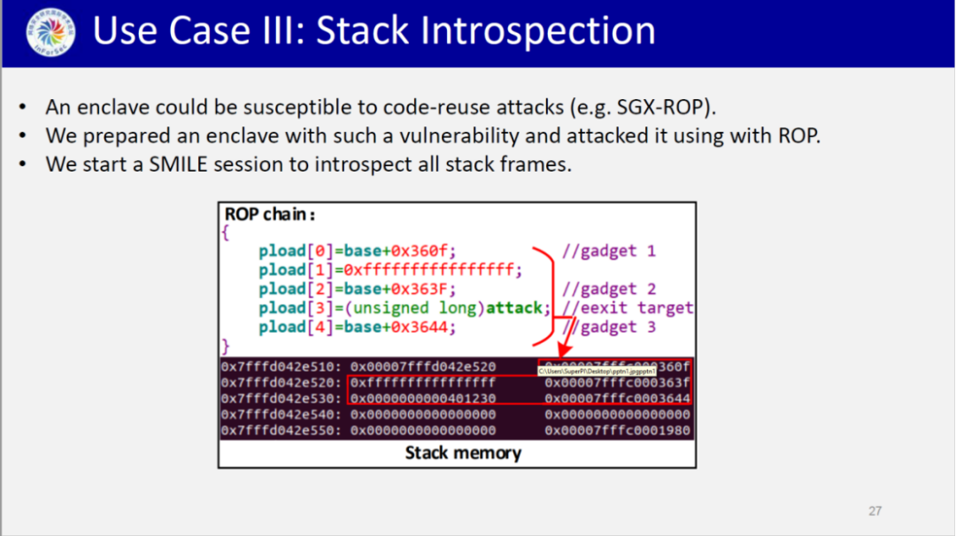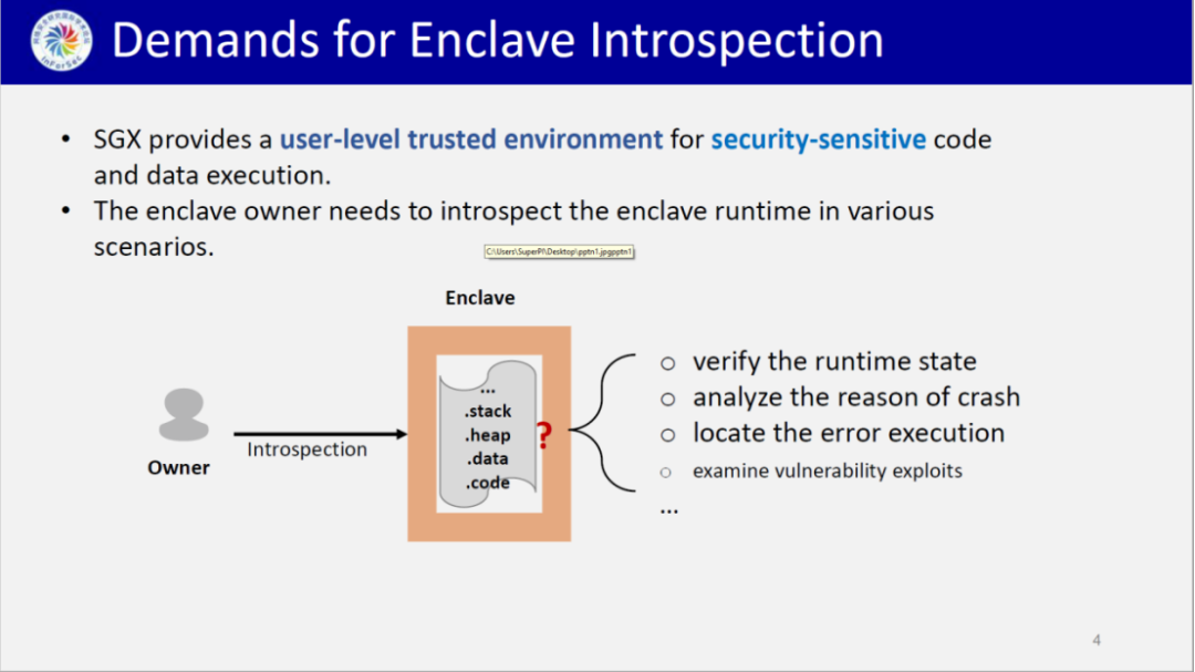 周雷博士后首先介绍了飞地(Enclave)内存自省的实际需求。SGX提供了用户级别的可信执行环境(即飞地)来保护安全敏感的代码和数据,该特性能有效防止外部软件访问其可信内存区域,但该特性阻碍了用户对飞地内存自省的合法需求,例如,当飞地内部存在ROP攻击时用户如何安全地获取飞地堆栈内存来进行分析。