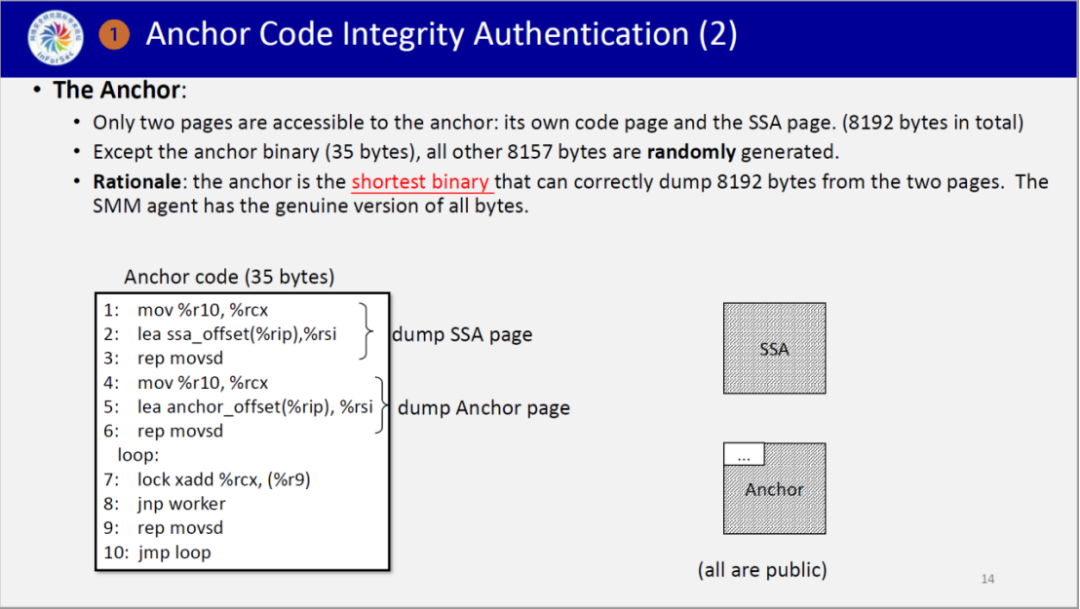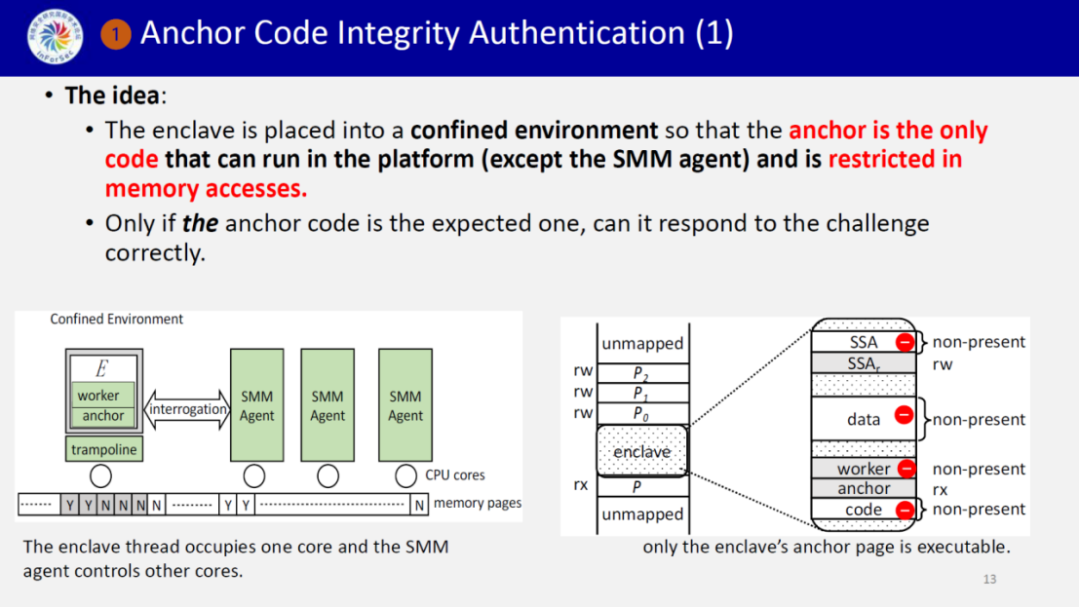 为了帮助理解SMILE的工作机制,周博士展开介绍了Anchor代码完整性认证的具体方案,其核心思想在于将飞地置于受限环境内,此时只允许anchor代码执行,并且内存访问也是受限的,只有在anchor代码符合预期时,才能正确通过认证。