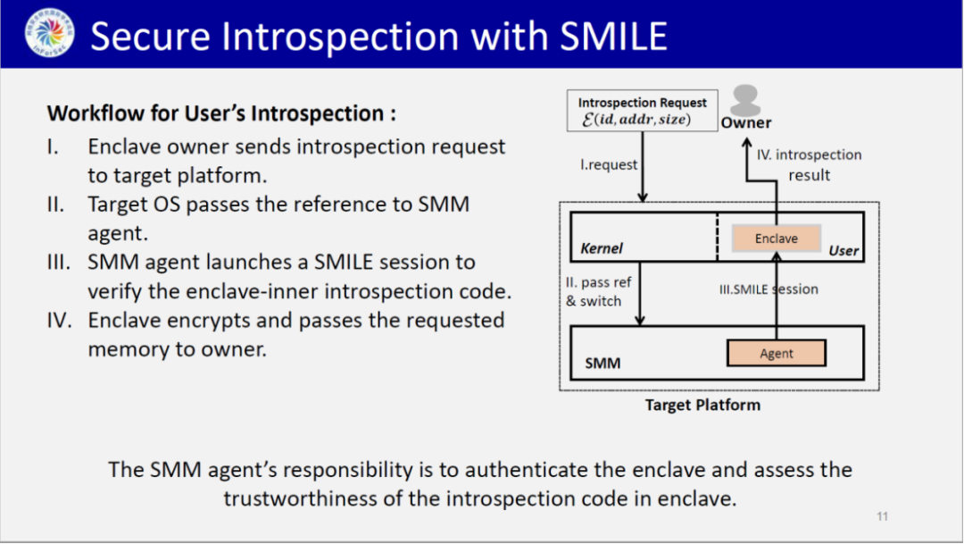 针对上述挑战,周博士提出了他们的解决方案,SMILE,利用SMM辅助,在不破坏飞地安全性的前提下实现对飞地内存的安全分析。