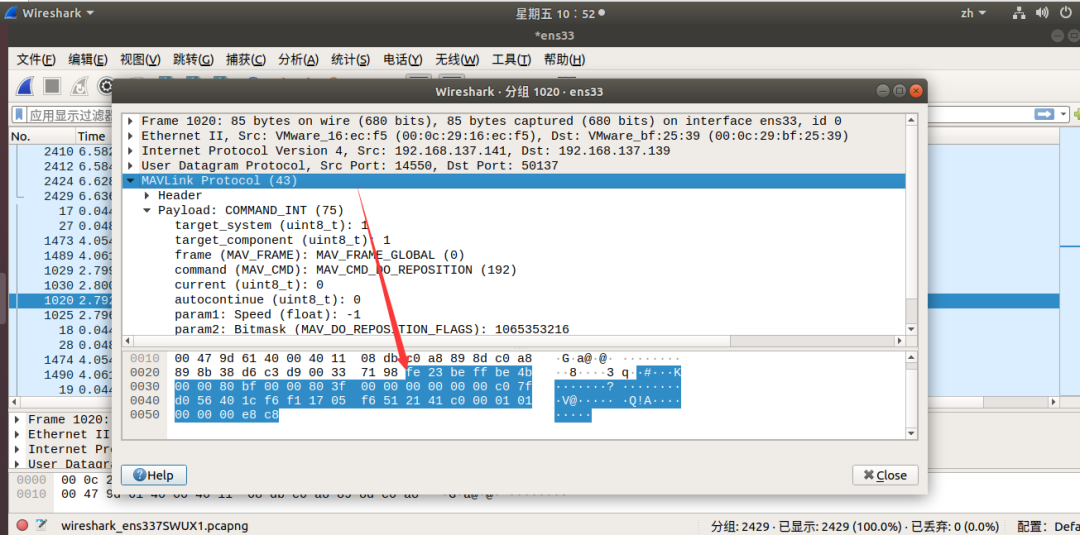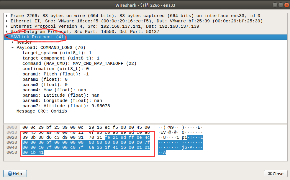 点开一个数据包,点击MAVLink Protocol项,可以获取到数据包中的关键参数: