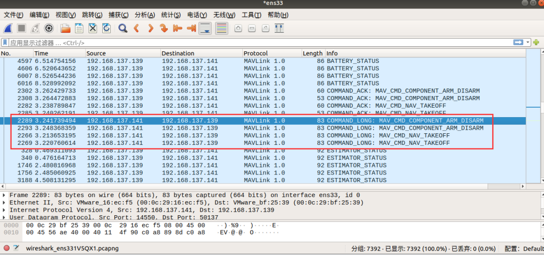在attack计算机中查看wireshark监听到的数据包,点击info按照指令排序之后,可以发现QGC地面控制站向px4无人机发送起飞指令,这里两个关键指令: