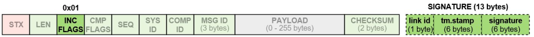 (4)可选用的SIGNATURE:最后,Mavlink 2.0使用可选的13字节签名字段来确保链接被篡改。此功能显着改善了Mavlink 1.0的安全性,因为它允许对消息进行身份验证并验证消息源自受信任的源。如果INCFLAGS设置为0x01,则会附加消息的签名;