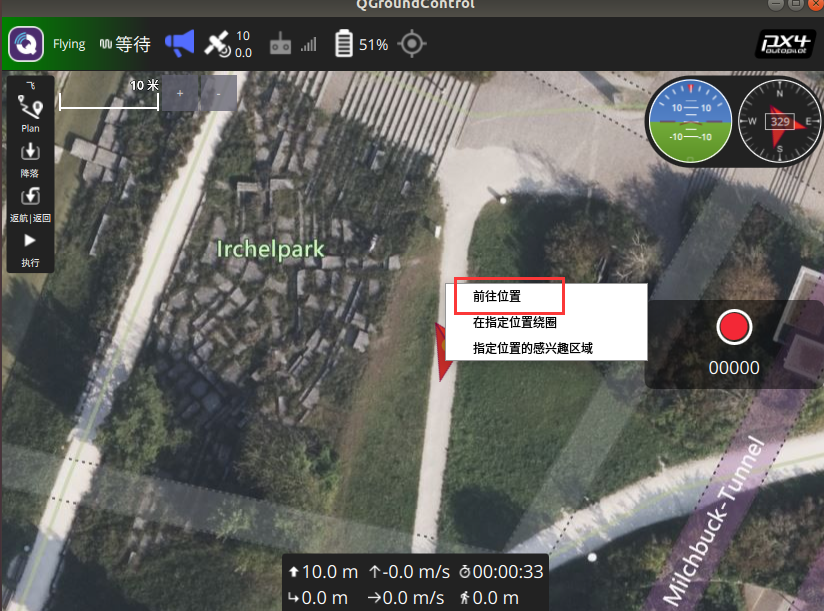 在QGC计算机中发送指令使无人机飞向指定位置,首先无人机处于飞行状态,点击地图上的某个位置,点击前往该位置