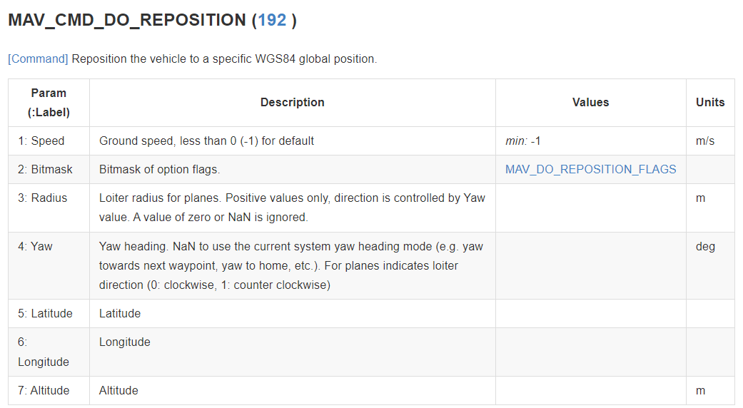 MAV_CMD_DO_REPOSITION指令的各参数中,可以修改纬度、精度、海拔高度,控制无人机位置