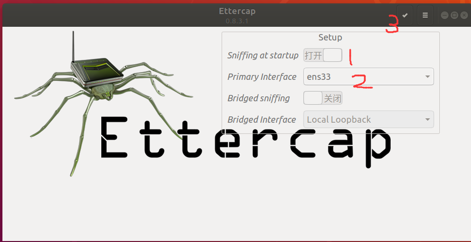 在attack计算机中打开ettercap,初始界面的这些选项比较好理解,不需要修改,直接点右上角√: