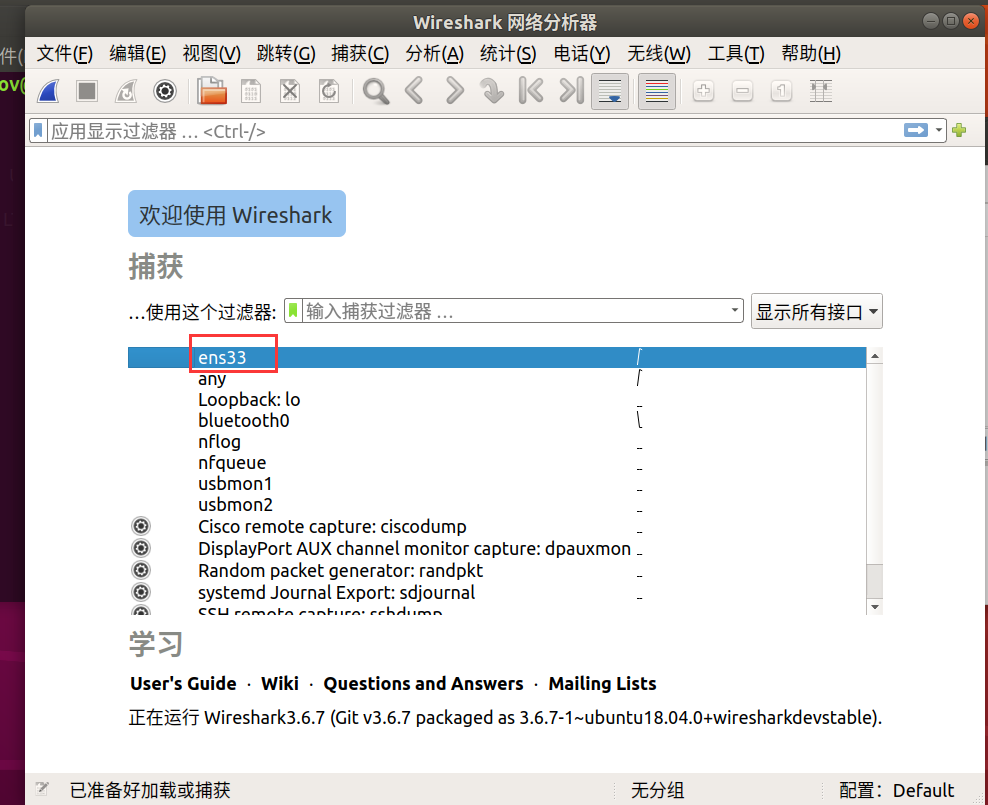 在attack中打开wireshark,选定eth0网卡: