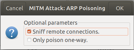 在右上角菜单MITM中找到ARP Poison,进行ARP欺骗。其中默认Sniff remote connections开启远程嗅探,让A和B的通信经过C。另外选项Only poison one-way表示只嗅探一边(例如:A的报文经过C发给B,B的回应直接发回A)。设置好后,点OK。