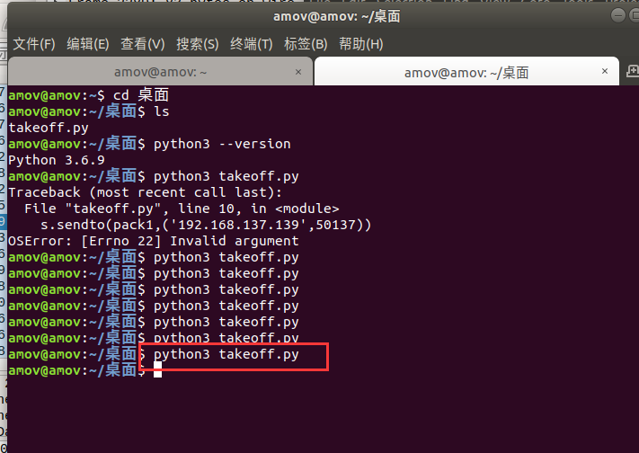 0xfe,0x21,0x9d,0xff,0xbe,0x4c,0x00,0x00,0x80,0xbf,0x00,0x00,0x00,0x00,0x00,0x00,0x00,0x00,0x00,0x00,0xc0,0x7f,0x00,0x00,0xc0,0x7f,0x00,0x00,0xc0,0x7f,0x6a,0x36,0x1f,0x41,0x16,0x00,0x01,0x01,0x00,0x1b,0x41在attack计算机中编写python脚本takeoff.py用于控制无人机起飞,指定发送到px4-gazebo计算机的ip192.168.137.139:50137端口: