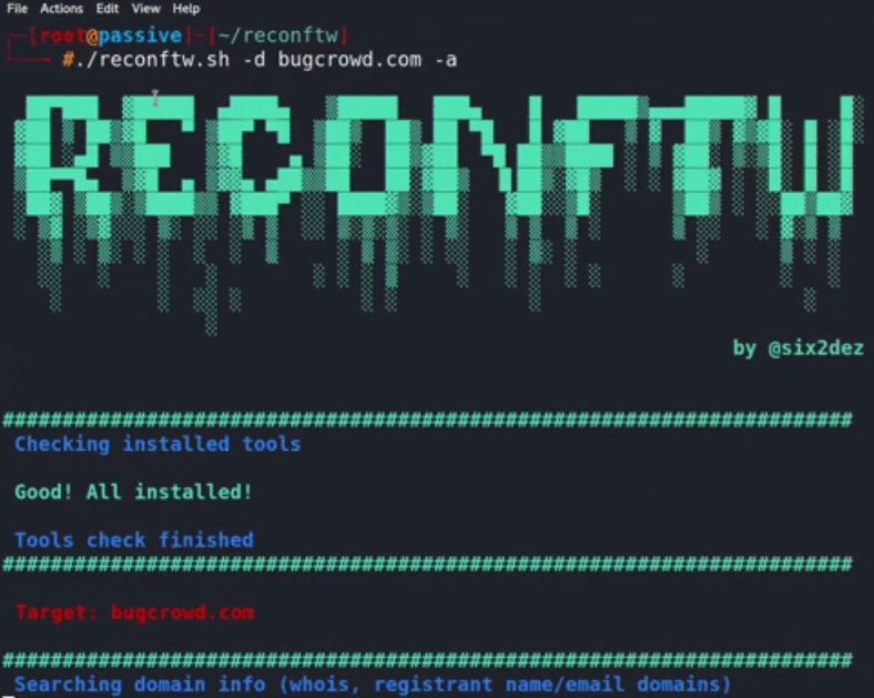 git clone https://github.com/six2dez/reconftwcd reconftw/./install.sh./reconftw.sh -d target.com -r