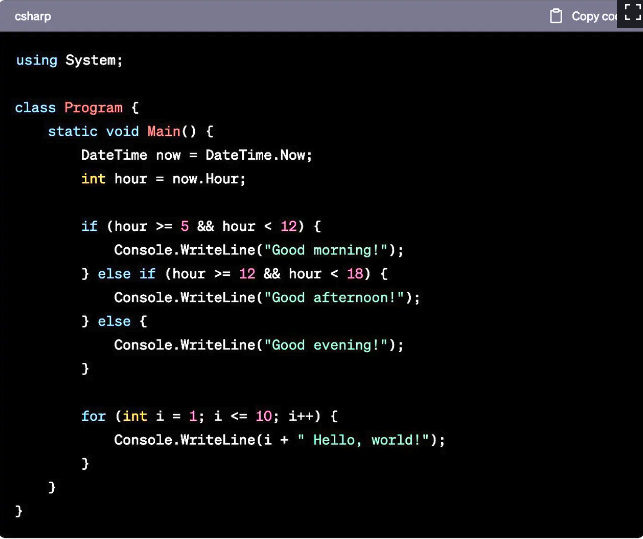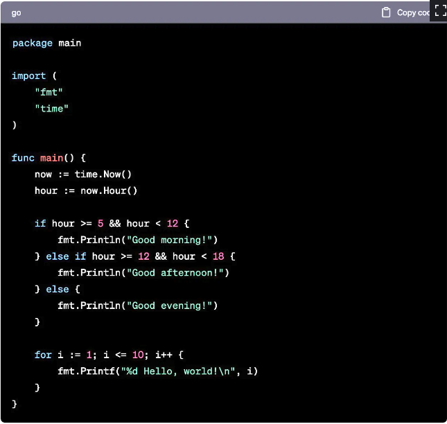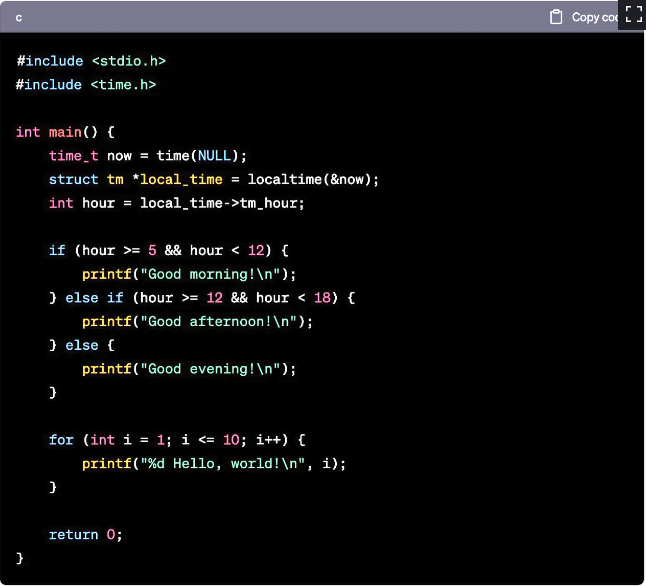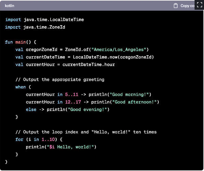 在本文中,我们将对O'Reilly Media 2023年受欢迎程度排名中的12种流行语言进行“Hello, world”编程测试。在测试中对 “Hello, world”编码进行了一些调整,加入一些变化:让ChatGPT输出“Hello, world”十次,每次递增一个计数器值。我还要求它检查时间并在每个序列开始时输出“早上好”、“下午好”或“晚上好”。这样的调整,在保证代码量不大的情况下,我们可以了解程序流程和函数调用情况,每种编程语言我都会将ChatGPT的代码输出进行截屏展示。在____中编写一个程序,根据俄勒冈州的时间输出“早上好”、“下午好”或“晚上好”,然后输出十行包含循环索引(从1开始)、一个空格,然后是“Hello, world!”的词语。 同时,对于每种编程语言,我还要求ChatGPT描述其主要用途。这是我用于此查询的提示:对于以下每种语言,编写一个简短的描述,说明其主要用途和区别因素:Java,Python,Rust,Go,C ++,JavaScript,C#,C,TypeScript,R,Kotlin,Scala。 现在,让我们来看看ChatGPT对于不同编程语言的驾驭能力吧。![]()