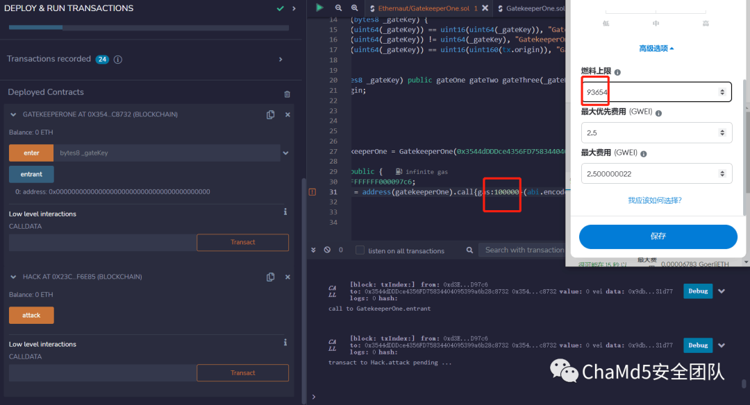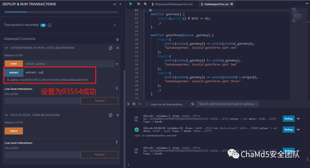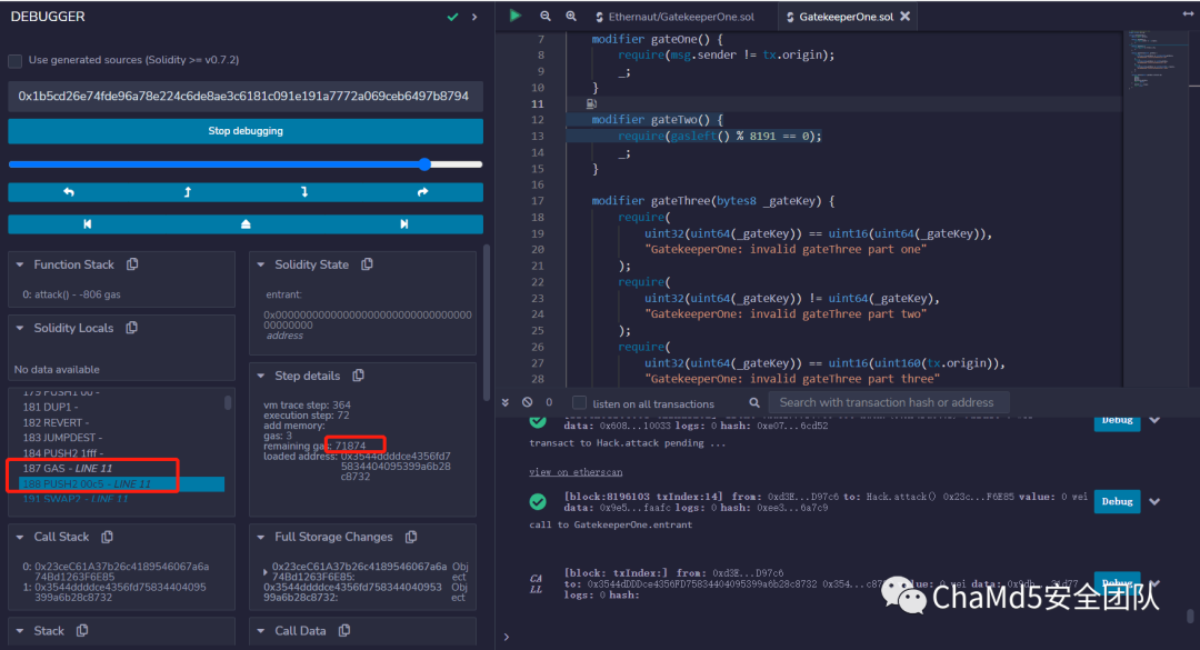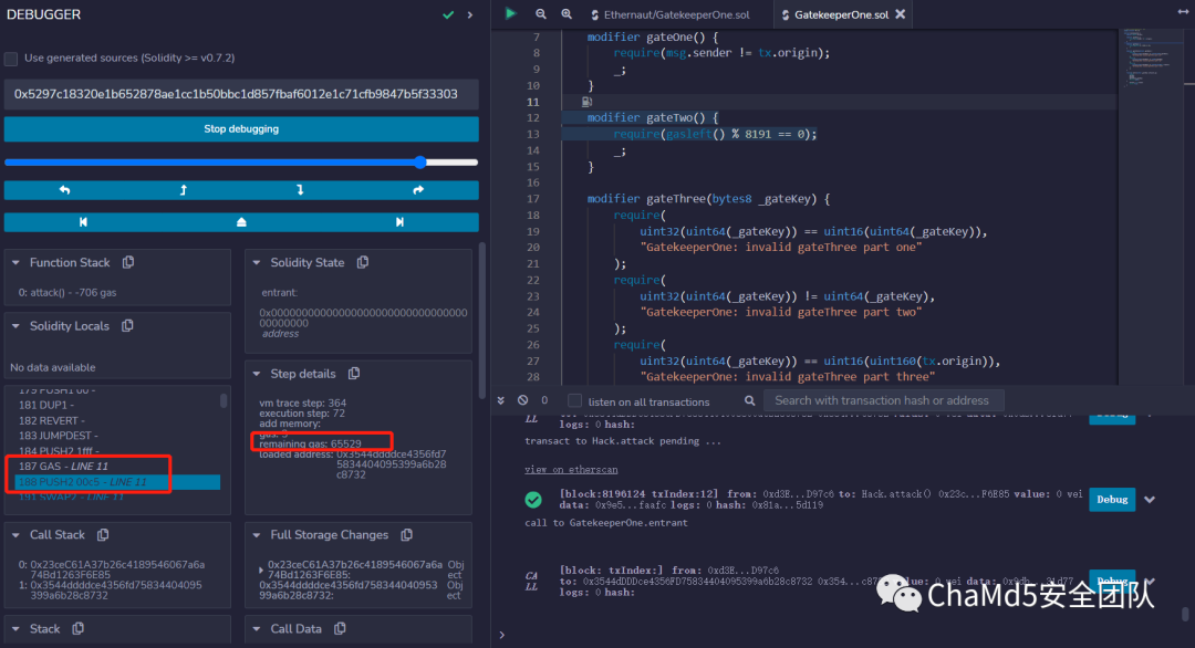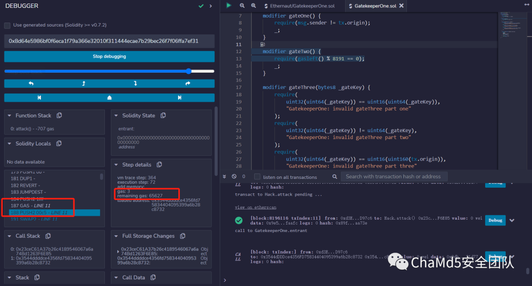 意思是,当程序执行到require(gasleft() % 8191 == 0)这一步时,交易所剩的gas取模8191的值为0,那么我们有两个思路来通过这个修饰器:暴力尝试和通过debug来查看gas消耗情况