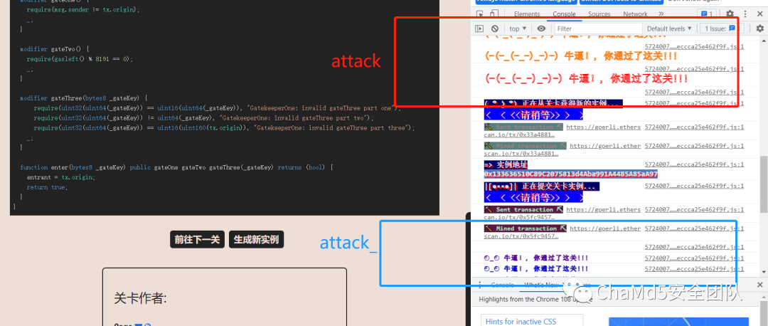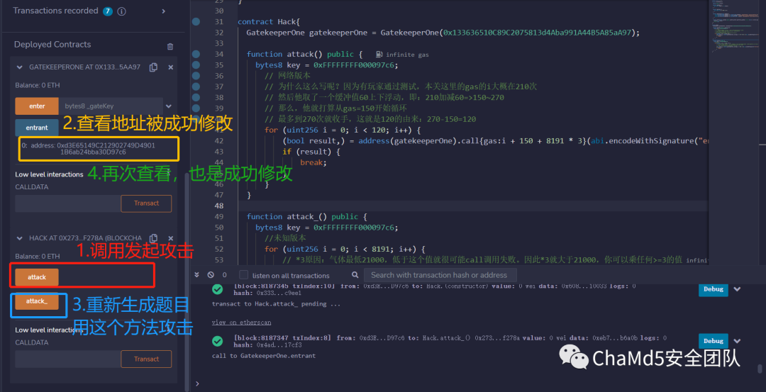 gas的剩余量取模8191的结果为0,那么暴力尝试的可能性就只有8191种,那么我们可以做一个循环,从0gas开始到8191gas进行调用方法,总有一次可以通过此修饰器,很有意思的是,网络上有大佬优化了这个暴力尝试的过程(attack方法是网上大佬的思路,attack_是真正的暴力破解)