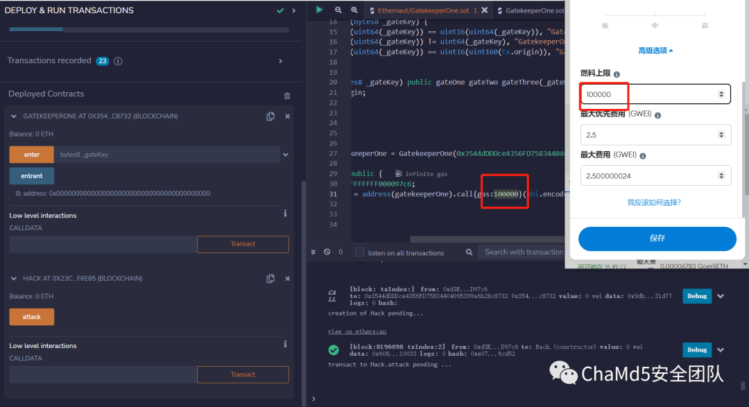 而且,在call语句设置的gas似乎是没用的,程序只看交易的时候设置的gas上限。本题我的代码的call的gas一直是100000,然后交易的时候,gas交易上限不断改变,到了GAS操作码的时候remain gas也会产生变化