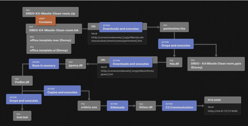 近日,Fortinet的研究人员披露了具有巴基斯坦背景的APT组织,SideCopy利用与印度国防研究与发展组织(DRDO)有关的ZIP压缩文档诱饵进行的网络钓鱼活动。该组织至少从2019年开始活动,并针对性攻击符合巴基斯坦利益的实体。此外,根据报道,SideCopy使用与DRDO相关的诱饵分发恶意软件的攻击活动,在2023年3月曾被Cyble和奇安信披露,并在上个月被Team Cymru再次披露。攻击链图如下图所示。