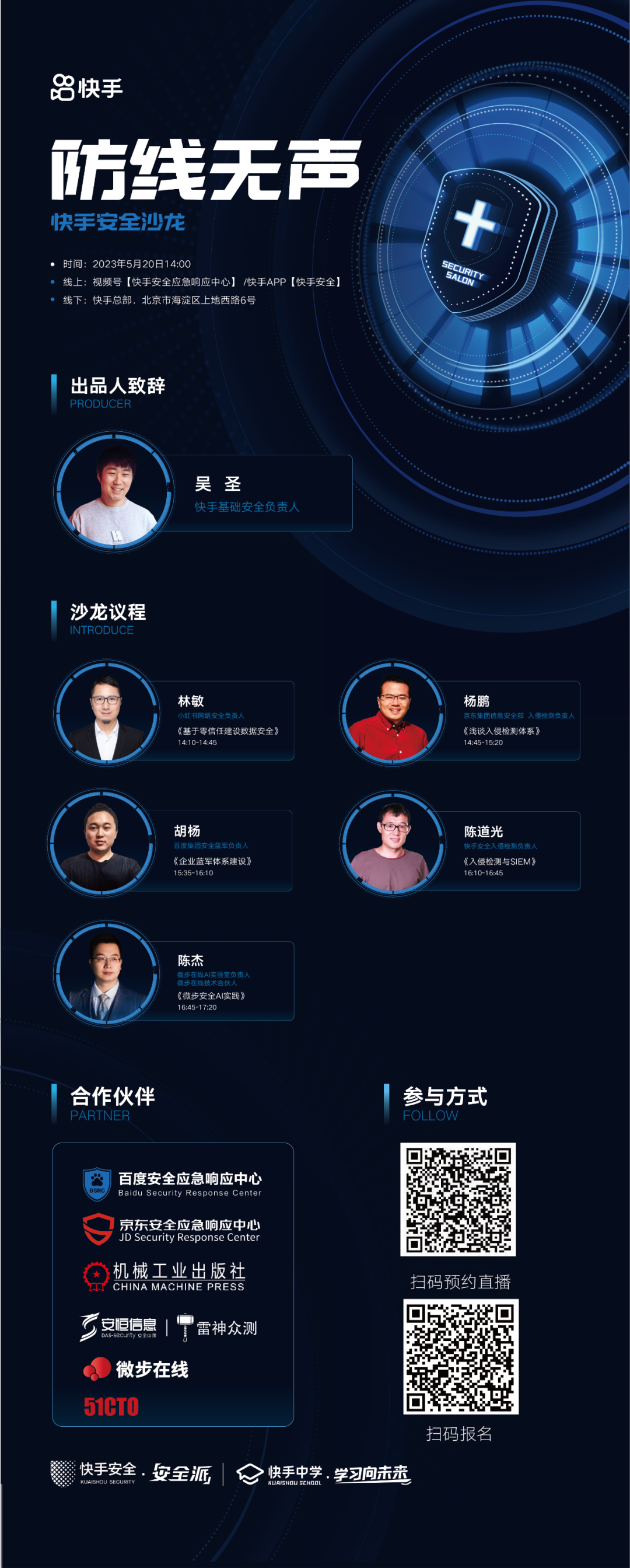 预告|五位大咖共聚一堂,快手安全派「防线无声」技术沙龙520等你来约!