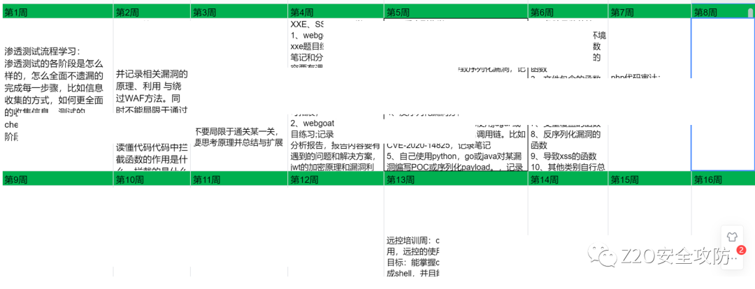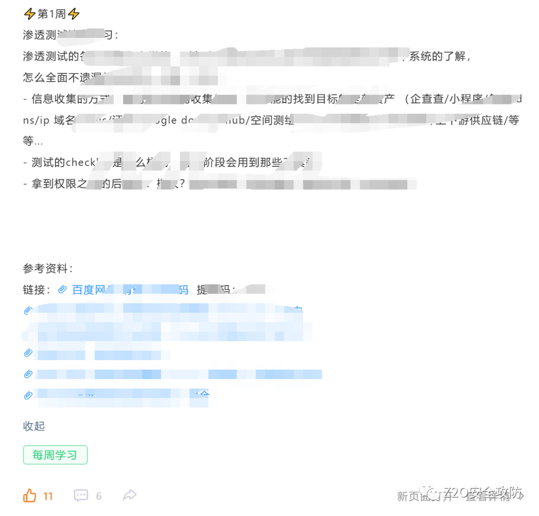 1、每周发布学习任务,由浅入深,从常见的漏洞原理、利用,到WAF绕过、钓鱼与免杀,再到Linux/Windows内网、域渗透,层层递进。会发布相应的参考资料,成员自行学习实践,并会根据每周任务选取1-3位完成优秀的成员,返还入圈费用。