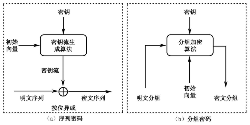 序列密码:将密钥和初始向量(IV)作为输入,通过密钥流生成算法输出密钥流,将明文序列和密钥流进行异或,得到密文序列。