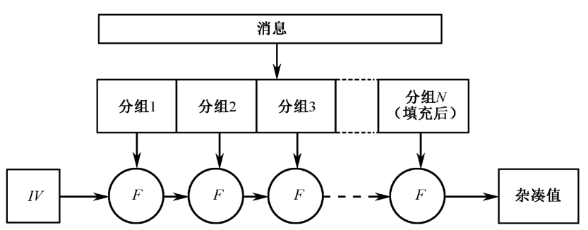 M-D结构即将输入消息进行填充分组,压缩函数通过初始向量进行初始化,本组与上一组消息结果产生中间值,最后一个压缩函数的结果就是最终的杂凑值。