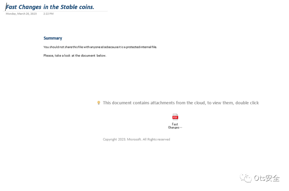 通过使用 Emotet 和其他恶意软件的攻击中也证实了通过利用 OneNote 文件感染恶意软件的方法。这在通过电子邮件附件传播感染的攻击类型中变得越来越流行。DangerousPassword 使用类似的攻击技术:它发送嵌入恶意软件的 OneNote 文件,如图 4 所示,单击查看 OneNote 文件时出现的图标(图 4 中的 PDF 图标)会导致恶意软件感染。
