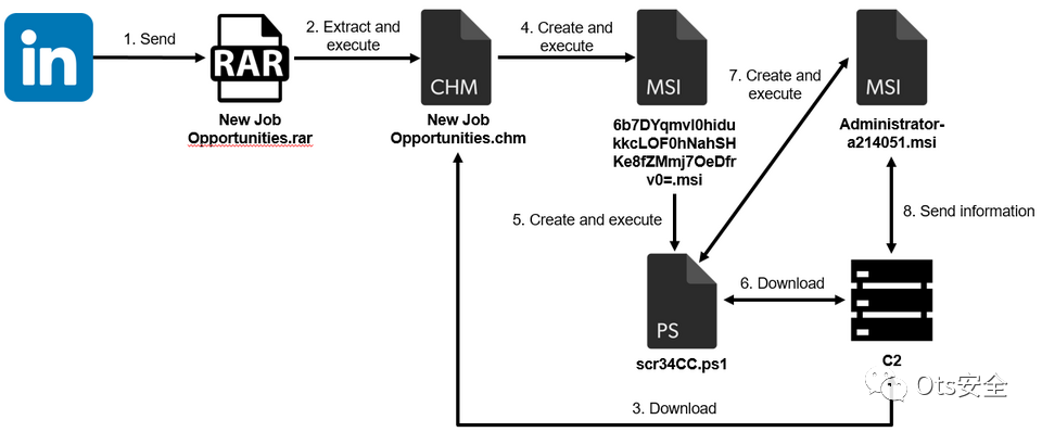 除了将恶意软件作为电子邮件附件发送外,攻击者还可能通过 LinkedIn 联系目标并向他们发送恶意软件。图 1 显示了通过 LinkedIn 发送的恶意软件如何感染主机。