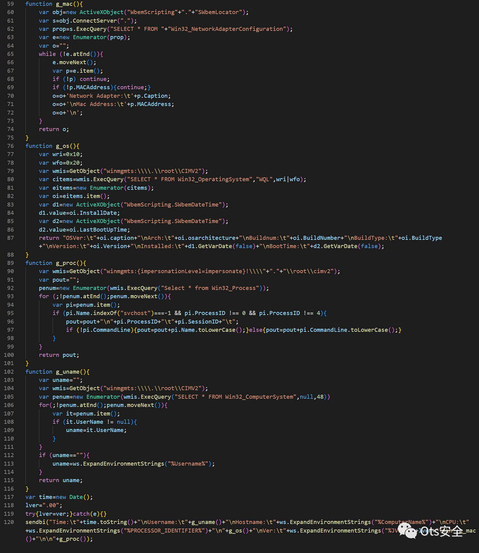 图 2 显示了用于收集有关受感染主机的信息的部分恶意软件代码。你可以看到它是用 JScript 编写的。