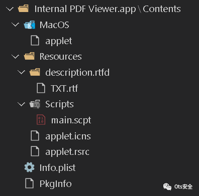 如图 8 所示,包含一个 AppleScript,它使用 curl 命令下载未经授权的应用程序,然后执行它。main.scpt