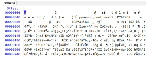 执行文件是由PyInstaller封装的Python程序。我们用pyinstxtractor提取它,发现它的主代码文件“contain.pyc”中的“PYARMOR”字符串,是Python脚本的混淆工具,使恶意软件更难被分析和检测。我们从_pytransform.dll中提取了密钥和iv,并使用AES-GCM解密了“contain.pyc”。