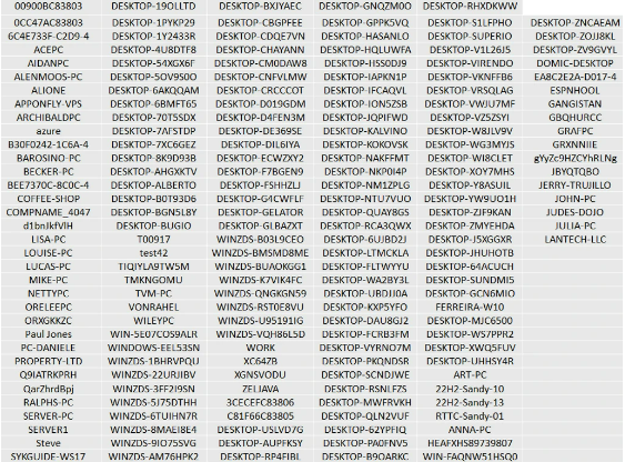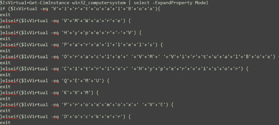然后,它比较产品模型,看看它是否匹配以下任何一个:VirtualBox、VMWare、Hyper-V、Parallels、Oracle VM VirtualBox、Citrix Hypervisor、QEMU、KVM、Proxmox VE或Docker,如下图所示。它还将受害者的主机名与来自VirusTotal设备或其他扫描仪/虚拟机的187个名称进行检查,如下图所示。