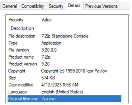它从evidtextractor[.]com下载“zzyy.zip”。解压后的文件(一个7-zip的独立控制台)的详细信息如下图所示。下图显示了它利用“7za.exe”用参数“-p”加密文件,这意味着用密码压缩文件。它还生成一条保存在“KodexRansom”中的勒索消息。
