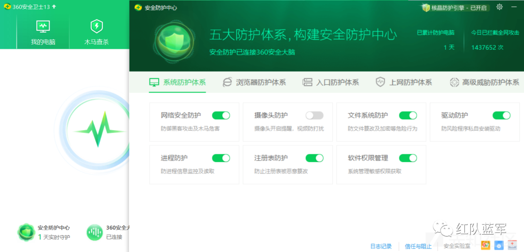 物理机开启核晶模式的360防护强度上要比虚拟机上的强,我们就以此状态下的为准来测试。