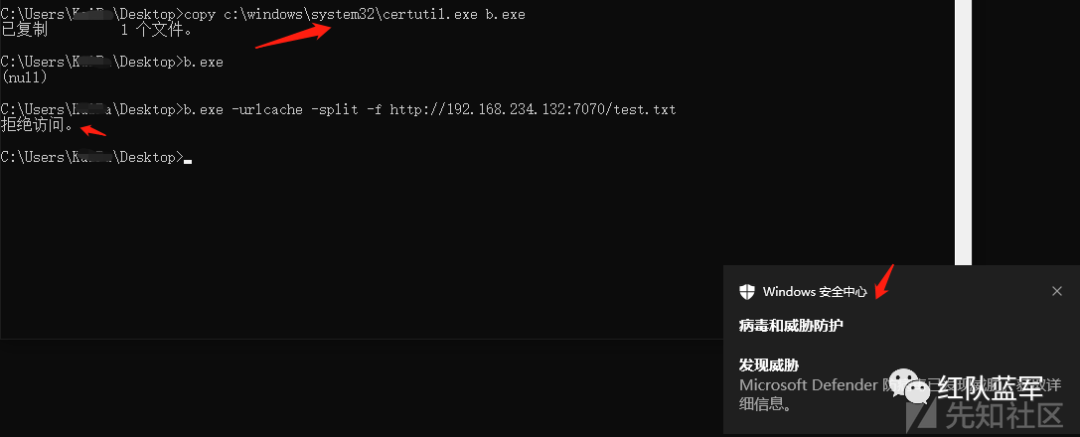 可见并不是简单匹配命令语句,也会动态检测命令参数这些。既然这样,复制certutil程序,更换其他路径和文件名试试